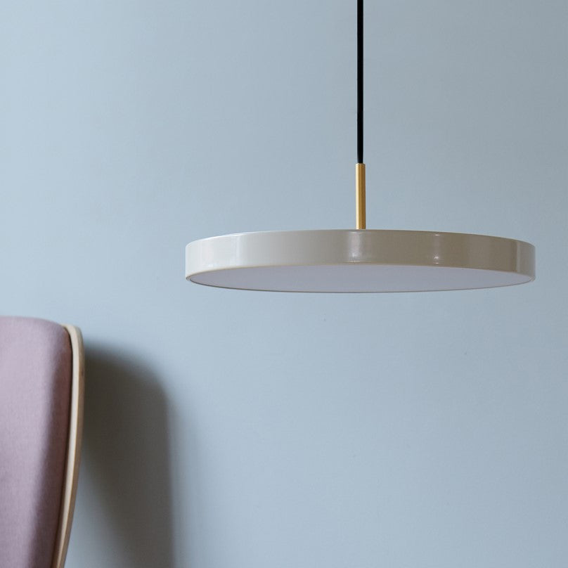 The Asteria pendant lamps come in 2 sizes and 7 colors with a brass detail, that can be changed for steel or black in minutes to ensure a flexible design that matches your personal style.