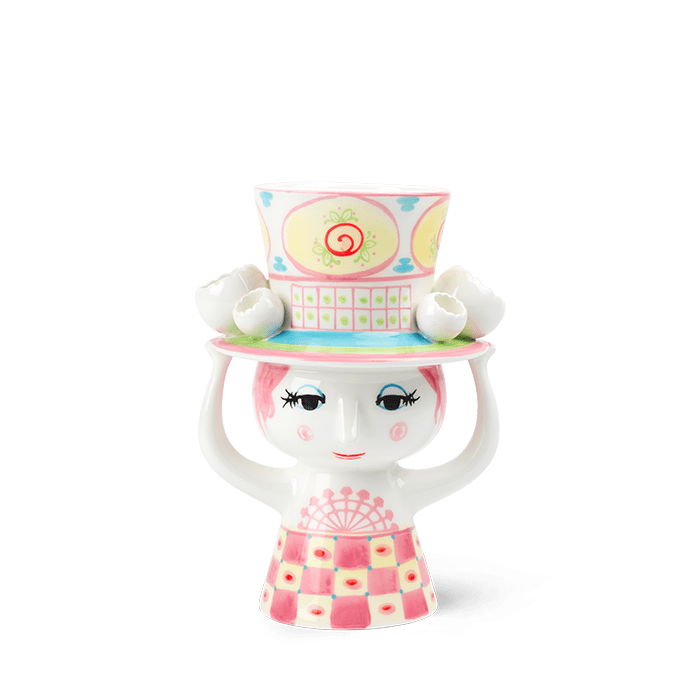 Invite a true Lady into your home and let her fill it with cheerful vibes through her vibrant colors, quirky details, and hand-painted decorations. The vase is hand-decorated from top to bottom with intricate motifs inspired by Wiinblad’s rich archive. The base features the iconic face with almond-shaped eyes, a triangular nose, rosy cheeks, and a playful smile. With her sculptural arms, the hand-painted Lady holds her grand hat, adorned with charming ceramic tulips on each side.