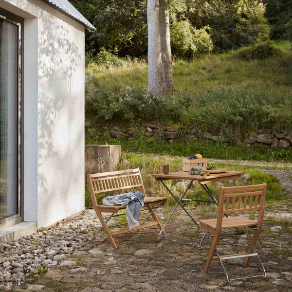Lilleø er et fleksibelt udemøbelsæt designet af Thomas E. Alken og produceret i teaktræ og rustfrit stål. Møblerne har et let og underspillet skulpturelt udtryk, der klæder omgivelserne, og sættet passer perfekt til steder, hvor pladsen er beskeden, men hvor kravet til æstetik, komfort og funktionalitet stadig vægtes højt. Lilleø kan klappes sammen, så de fylder ganske lidt i opbevaringen, og er derfor ideel til altaner, gårdhaver eller hyggelige caféer med små udendørsområder. Lilleø-sættet er en del af Sammen-serien, der er en af FDB Møblers populære havemøbelserier, også designet af Thomas E. Alken.
