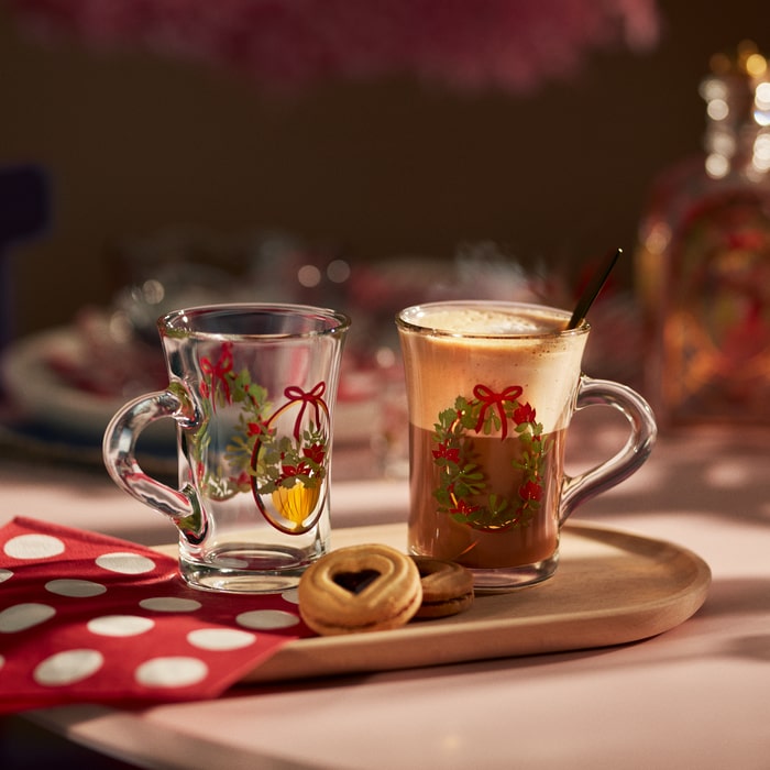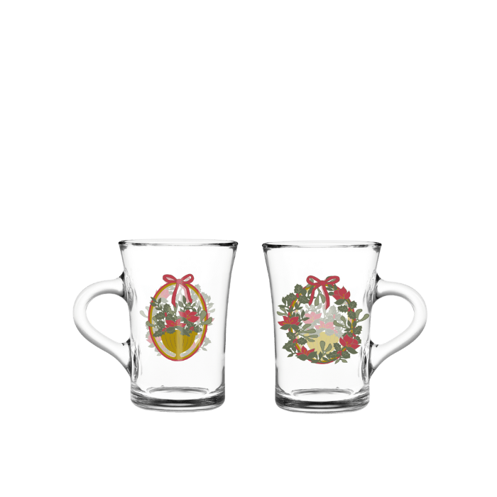 Plenty of Christmas gifts. A festive wreath made of lush greenery, Christmas roses, and holly berries. A traditional and lavish bouquet of Christmas flowers. Red ribbons. And a young couple holding hands under the mistletoe. With artist Jette Frölich’s iconic paper cuttings, Holmegaard Christmas invites us in 2025 to celebrate Holmegaard’s 200th anniversary with a journey into the world of the romantic Christmas. The 2025 motifs naturally adorn the series’ charming Christmas hot drinks glasses, which create a warm and nostalgic atmosphere, inviting cosy conversations and evoking the feeling of Christmases past. They come in a set of two, allowing you to enjoy the exquisite motifs together and appreciate the combination of Holmegaard’s passionate glass craftsmanship and Jette Frölich’s original artistic universe while savouring the many delicious warm drinks of the season.