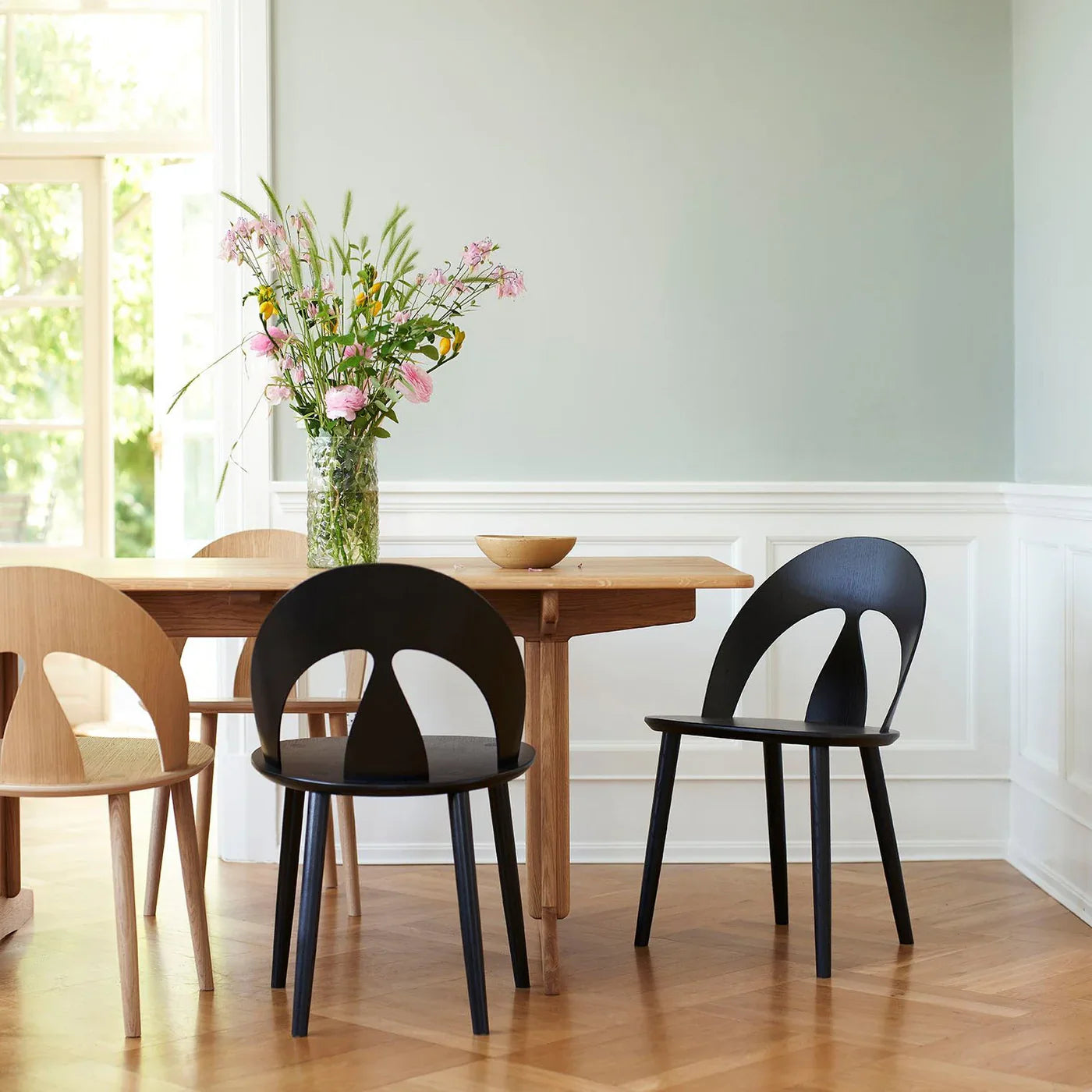 The ideas behind Børge Mogensen's old J45 dining chair seem completely relevant and in step with the times today. The chair reflects the shapes of nature and the material wood and combines stylish design with comfort. It was an almost revolutionary idea when FDB Møbler launched the J45 in 1950. The chair also stands out from what Børge Mogensen later became known for: the slightly square chairs and sofas. The characteristic backrest, which forms an organic shell, leans back slightly and springs slightly, making the chair very comfortable. An iconic piece that both shows the interplay between nature and design and tells the story of the early work of one of our most famous furniture designers. A stylish choice for the dining room.