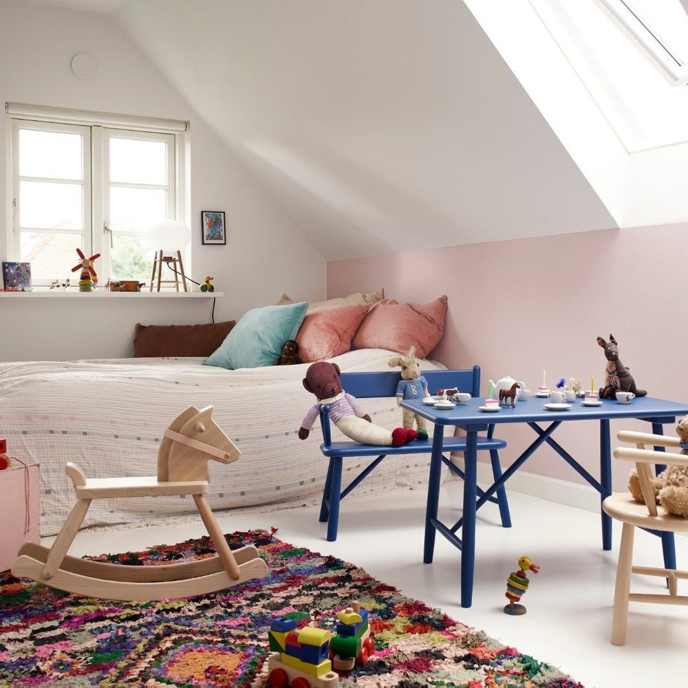 The rocking horse is a timeless icon from the children's room. It gives smaller children the freedom to sit – without necessarily sitting still – and no other piece of furniture seems to gather so many stories and adventures. Therefore, it felt only natural to add a rocking horse to Børge Mogensen's fine series of children's furniture. FDB Møbler reached out to designer Sarah Moutouh, who, besides being a skilled designer, is also a granddaughter of Børge Mogensen. With inspiration from the knight chess piece, Sarah Moutouh elegantly captured the simple and iconic expression of the horse and created the P12. The horse's reins are made of grain leather, which will gain a beautiful patina over time.