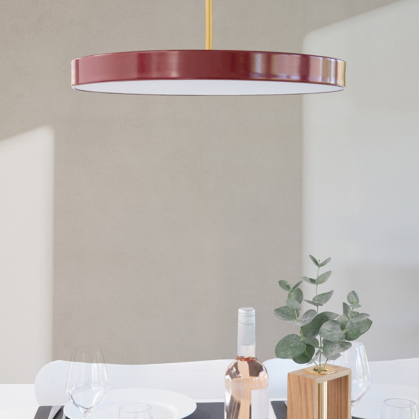 The Asteria pendant lamps come in 2 sizes and 7 colors with a brass detail, that can be changed for steel or black in minutes to ensure a flexible design that matches your personal style.