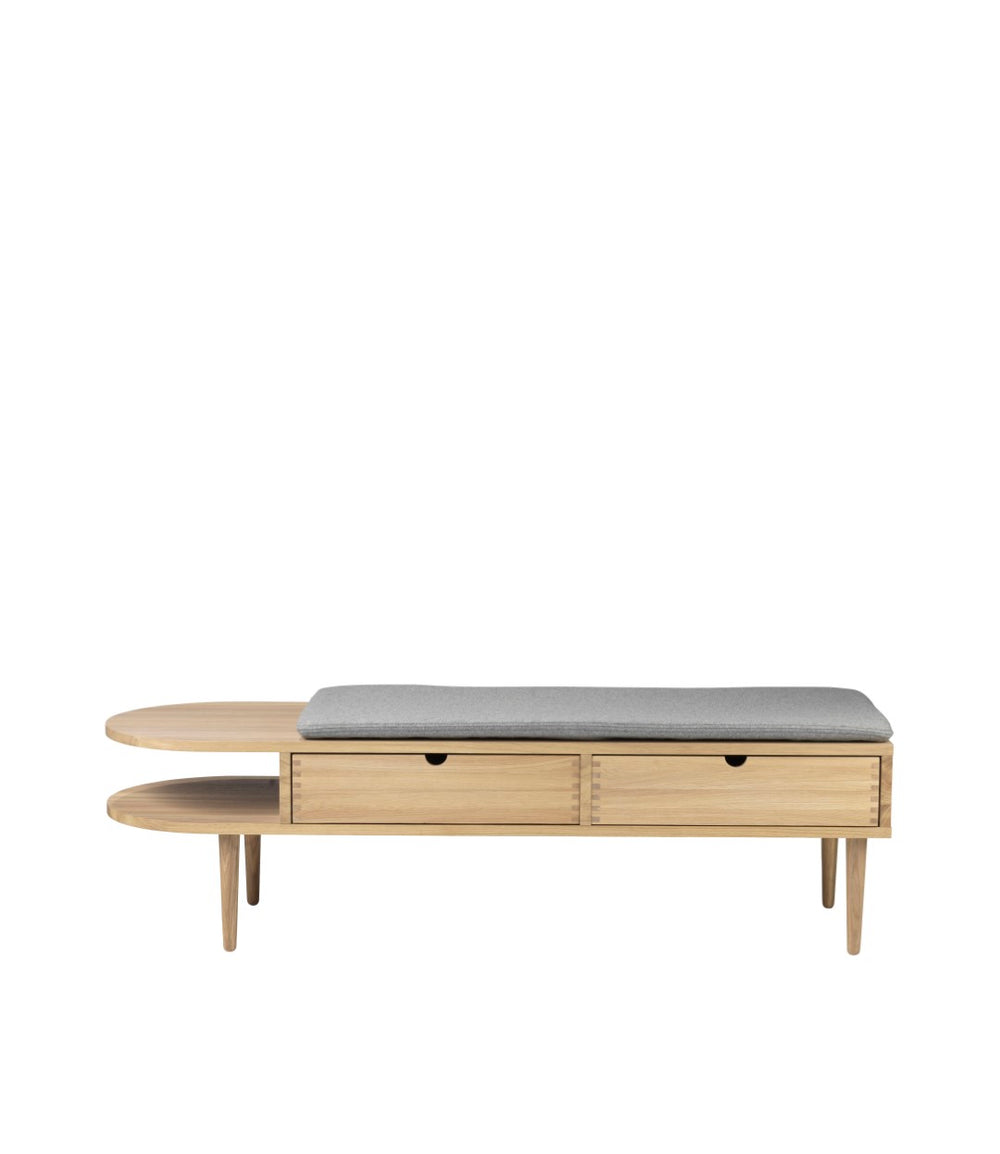 The bench is created by the two furniture designers Diana Claudia Moț and Isabella Bergstrøm. It can be used both as a low table and a bench. If you choose to use it as a bench, a beautiful and simple cushion that is both comfortable and decorative is a natural choice. The cushion is available in both leather and felt. The leather cushion has a look associated with some of the Danish design classics from FDB Furniture and felt is one of the oldest known textiles and has a very special place in Scandinavian furniture design.