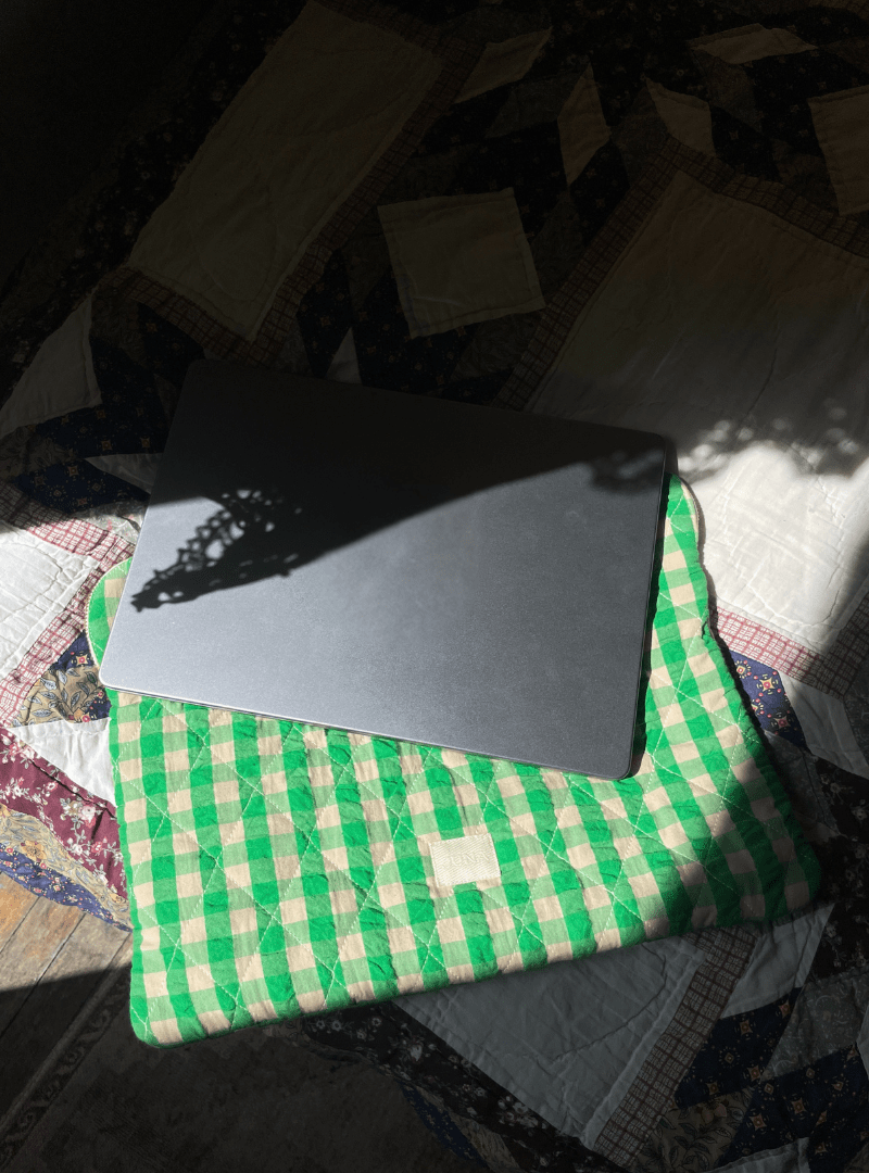 Crafted from surplus bedding fabric that would otherwise go to waste, the Pondus Laptop Bag reflects JUNA’s commitment to responsible design and circular principles. Each sleeve is sewn from 100% organic cotton, a fabric known for its light and airy texture, here reimagined in a quilted design that is both practical and stylish. The light blue and white check pattern gives it a nostalgic yet modern feel, adding a playful personality to an everyday essential.