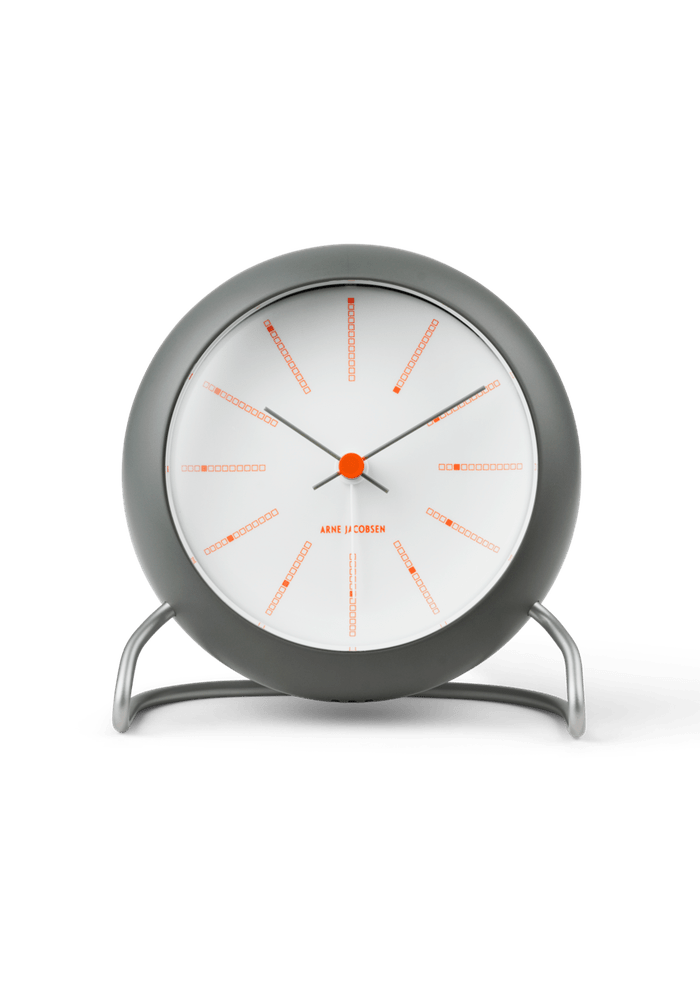 The sleek Bankers clock was designed in 1971 specifically for the National Bank of Denmark. In 1978, when the building was complete, the Bankers Clock was given pride placement in the 65.6 ft. high foyer. This unique table clock expresses Danish design in a neutral, yet richly detailed fashion. It will be the perfect decorative and minimalistic design piece for your interior. The table clock's features include an alarm, snooze and light sensor. The third hand of the clock is used to set the alarm.