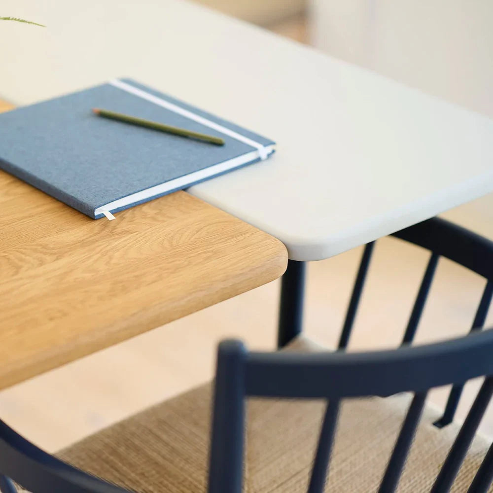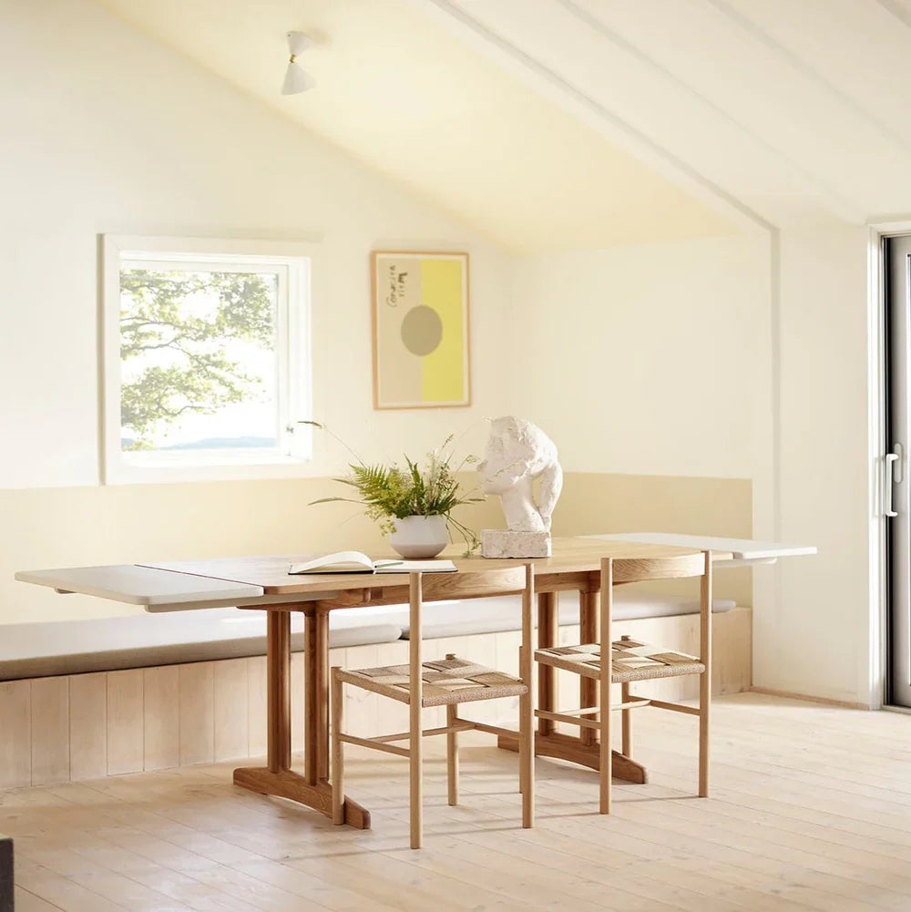 The Shaker table was not exclusive to Børge Mogensen’s private dining room. It was also a table type that he returned to time and again throughout his career as a furniture architect. Børge Mogensen designed this model for FDB Møbler in 1950, but it was never put into production, possibly because of the cross-shaped legs, which back then were a bold design detail and one that was difficult to manufacture. Many years later, FDB Møbler launched the table which – despite changing social trends within interior design – remains a timeless and aesthetically durable design. With its elegant and unique underframe, which is drawn in under the tabletop, the simple rectangular surface appears to float freely in space while allowing plenty of legroom. The table comes across as being highly functional with a practical tabletop with rounded edges, and builds on Børge Mogensen’s unwavering requirement that a piece of furniture should serve its users and support human activities rather than forcing people to adapt to the furniture. Important before purchase: Please be aware that extension plates only will fit veneered oak tables purchased after spring 2022 and solid oak tables purchased after September 2024.