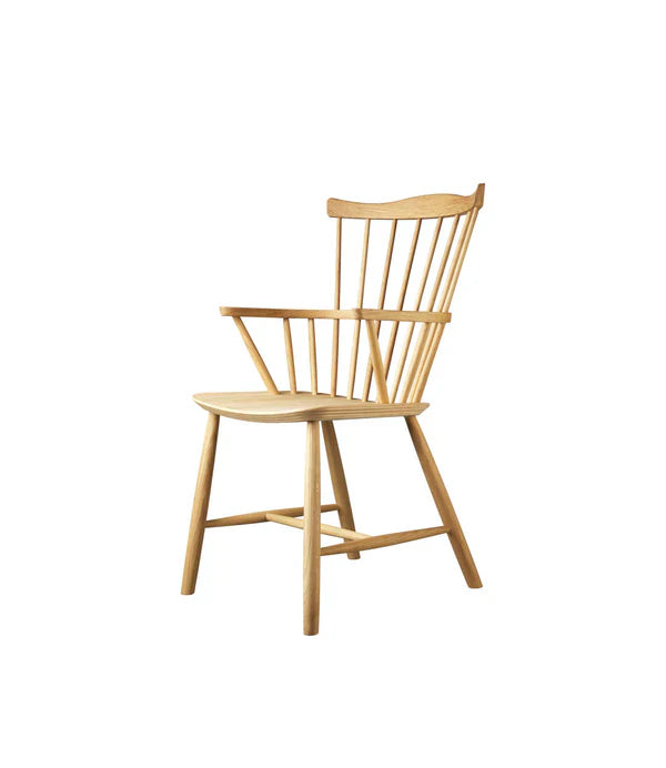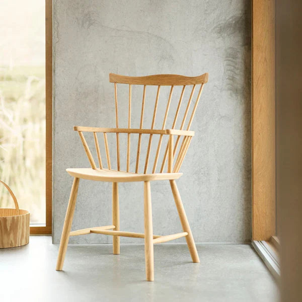 Børge Mogensen was already referencing historical classics when he designed J52B, his take on the English Windsor chair, in 1952. The Windsor chair was a solid and comfortable chair with roots in 16th-century England, and here FDB Møbler's head designer tried to lighten the expression with a range of simple staves. The result was a very comfortable chair with a simple and functional expression. The chair was reportedly President Kennedy's favorite chair to relax in. It can be used both as a dining chair and as a lounge chair.