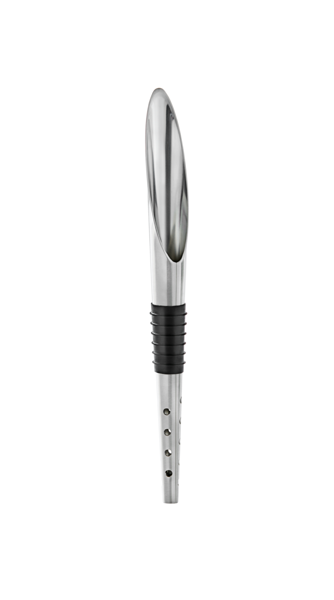 This stopper was designed by the wine expert Tom Nybroe to aerate the wine, expanding its surface area to develop the taste. The long reach of the wine pourer is evenly proportioned: combined with the decanting function, it allows the bouquet of the wine to really come into its own, giving you the best aromatic experience. The length and the holes in the pourer stopper are carefully aligned to allow optimum aeration and bring out the character of the wine.